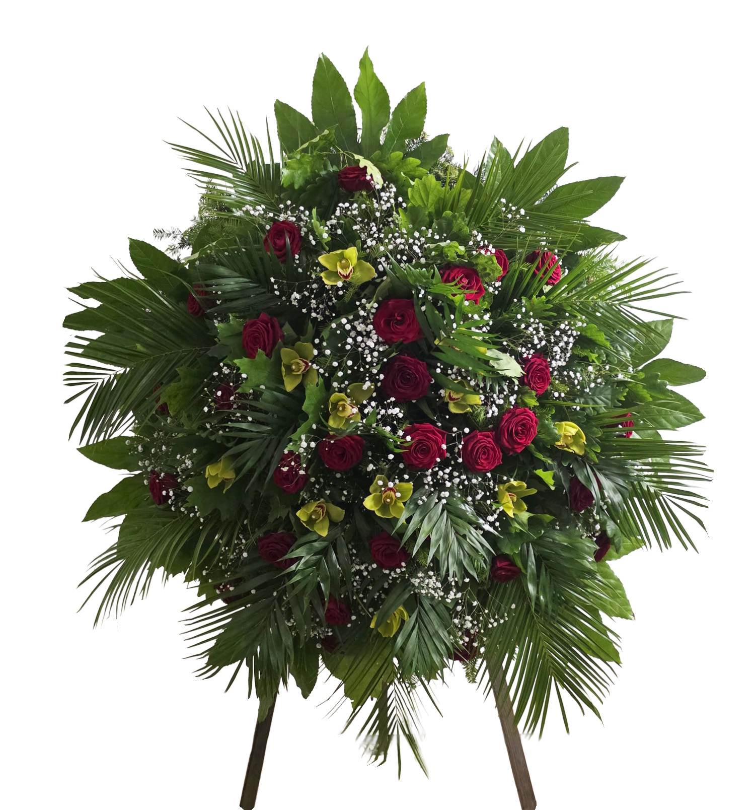 Kompozycja z bordowych róż i jasnozielonych storczyków, uzupełniona gipsówką i bujną zielenią, to wyważony i elegancki wyraz pamięci. Kontrast pomiędzy głęboką czerwienią a subtelną zielenią kwiatów nadaje całości charakter powagi i spokoju. Starannie dobrane rośliny i klasyczna forma sprawiają, że wieniec ten będzie odpowiednim wyborem niezależnie od okoliczności.