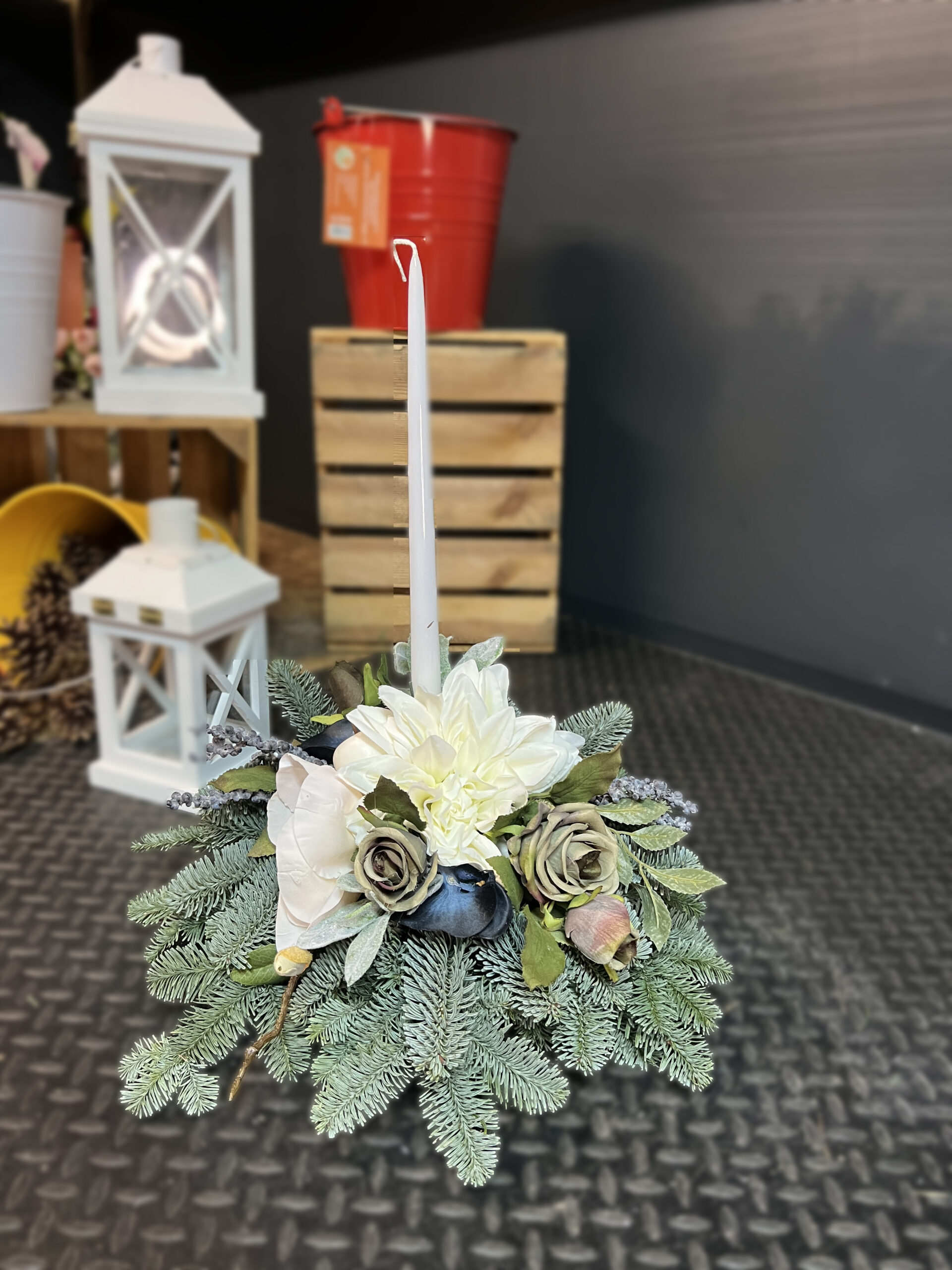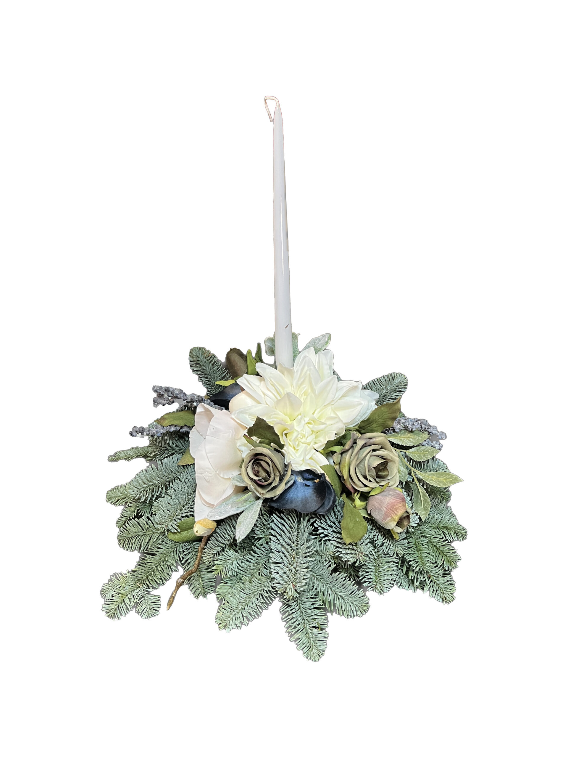 Stonowana, elegancka kompozycja wykonana na bazie naturalnych, ośnieżonych gałązek świerku. Centralnym akcentem jest smukła świeca otoczona jasnymi kwiatami, zielonymi różami i subtelnymi dodatkami florystycznymi, które nadają stroikowi spokojny i wyważony charakter. To delikatna dekoracja miejsca pamięci w okresie Bożego Narodzenia.