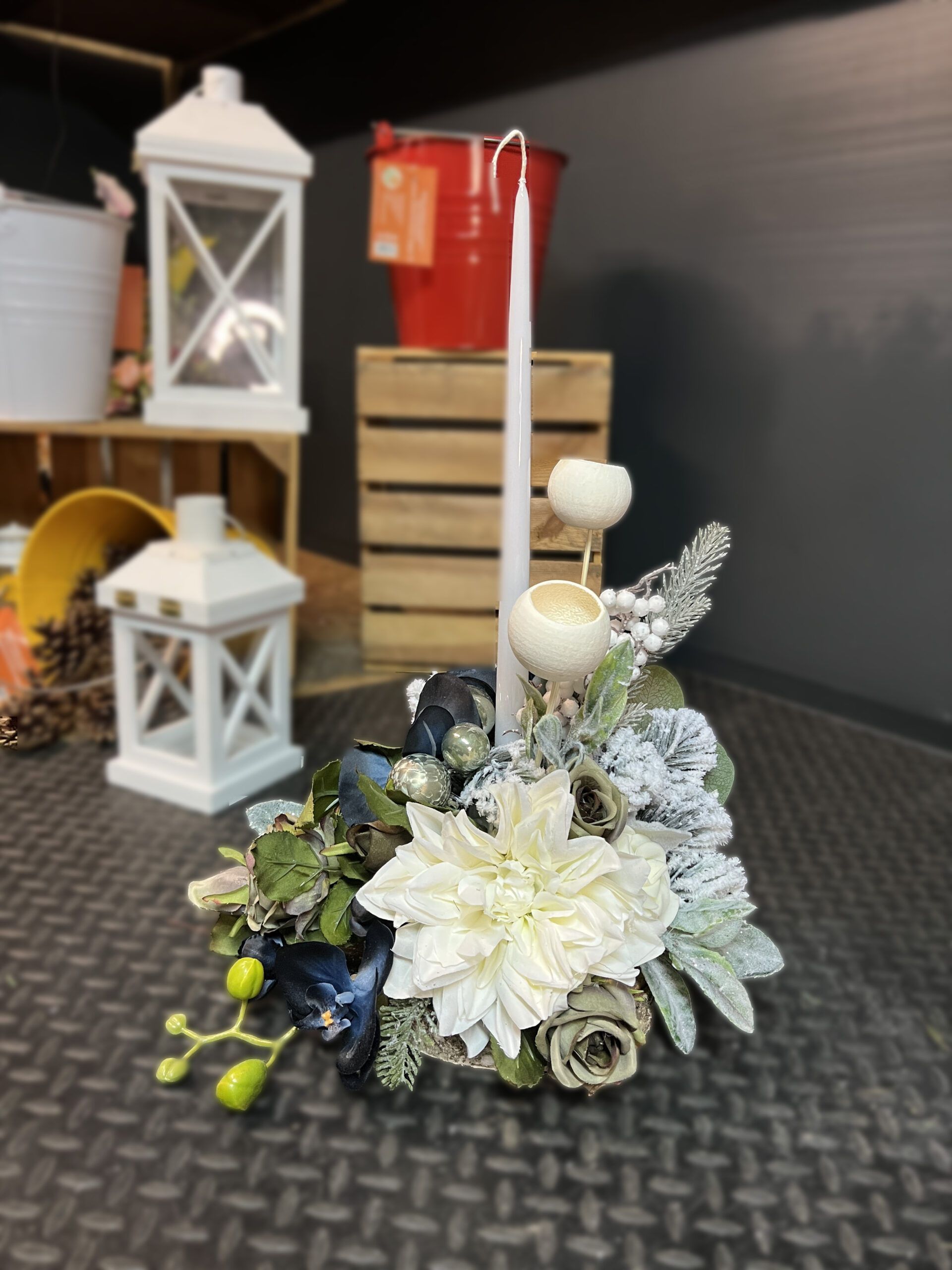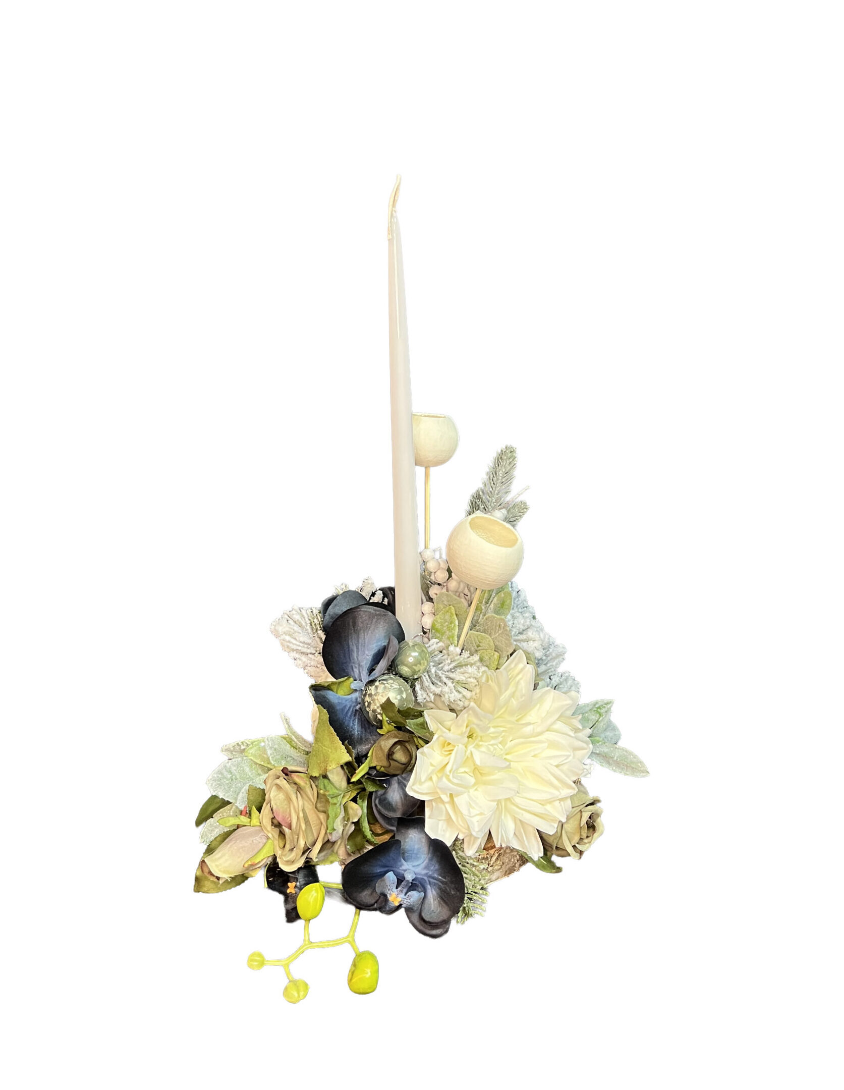 Delikatny stroik świąteczny utrzymany w chłodnej, eleganckiej tonacji. Kompozycja łączy kremowe kwiaty z ciemnymi, kontrastującymi akcentami oraz ośnieżoną zielenią, tworząc harmonijną i spokojną całość. Smukła świeca dodaje dekoracji symbolicznego charakteru, podkreślając jej przeznaczenie jako subtelnej ozdoby miejsca pamięci w okresie Bożego Narodzenia.