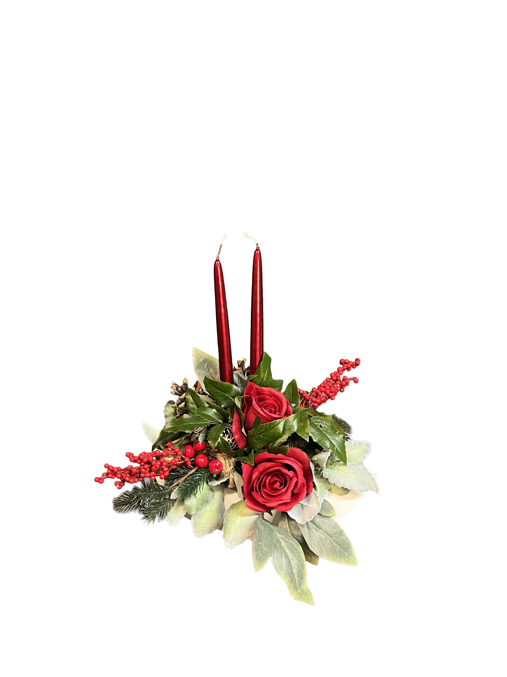Klasyczna kompozycja nagrobna z czerwonymi różami, gałązkami iglastymi i dekoracyjnymi dodatkami florystycznymi, uzupełniona świecami. Utrzymany w tradycyjnej kolorystyce, tworzy spokojną i godną ozdobę miejsca pamięci w okresie świątecznym.