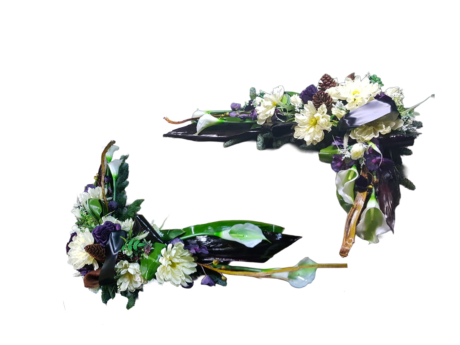 Zestaw dwóch spójnych kompozycji z kremowymi daliami, ciemnofioletowymi dodatkami i jasnymi kallami — elegancka dekoracja nagrobna o uniwersalnym charakterze.