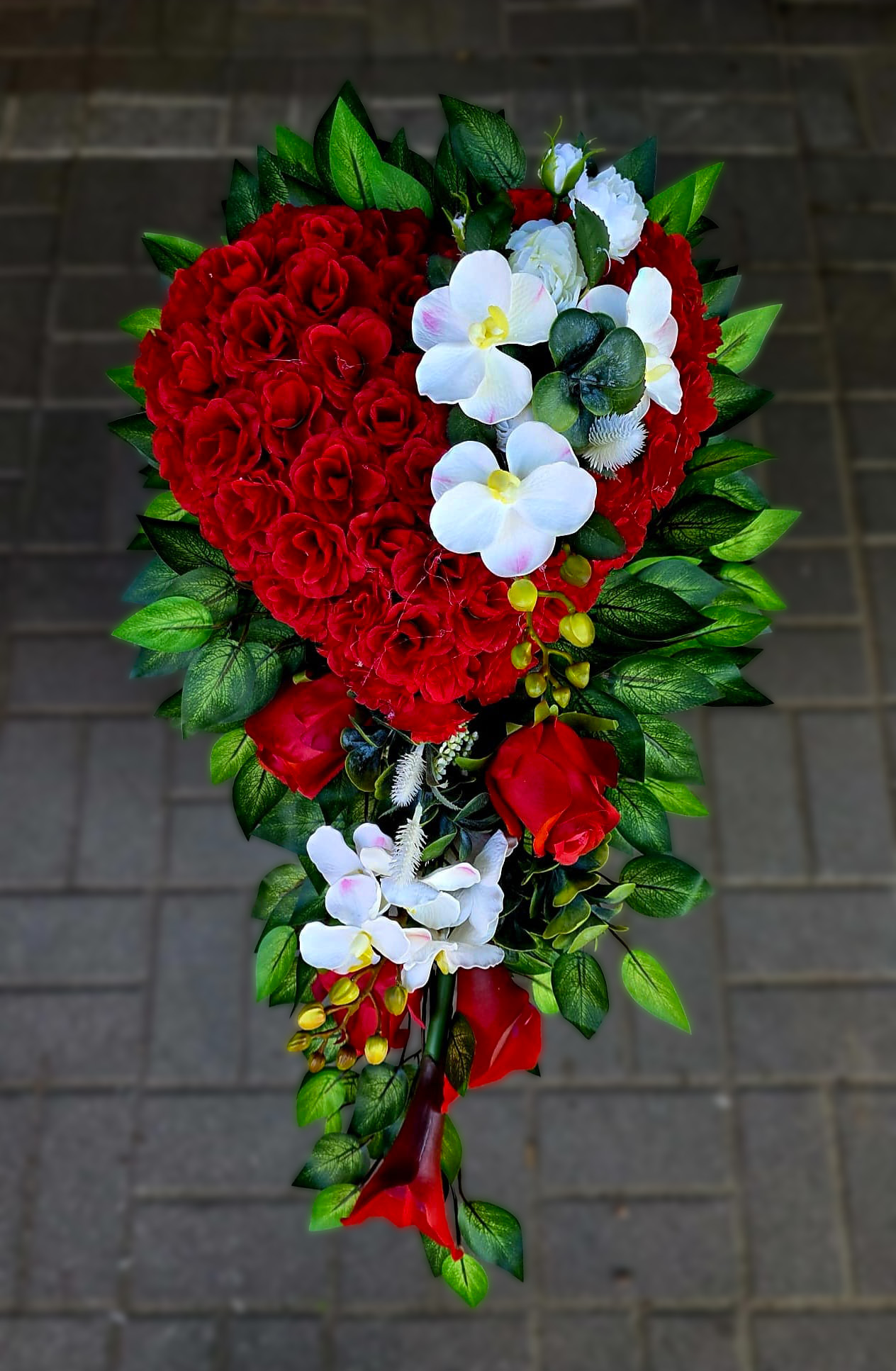 Stroik w formie serca z czerwonych róż, ozdobiony białymi storczykami i zielenią, stanowi wyraz miłości i trwałej pamięci.