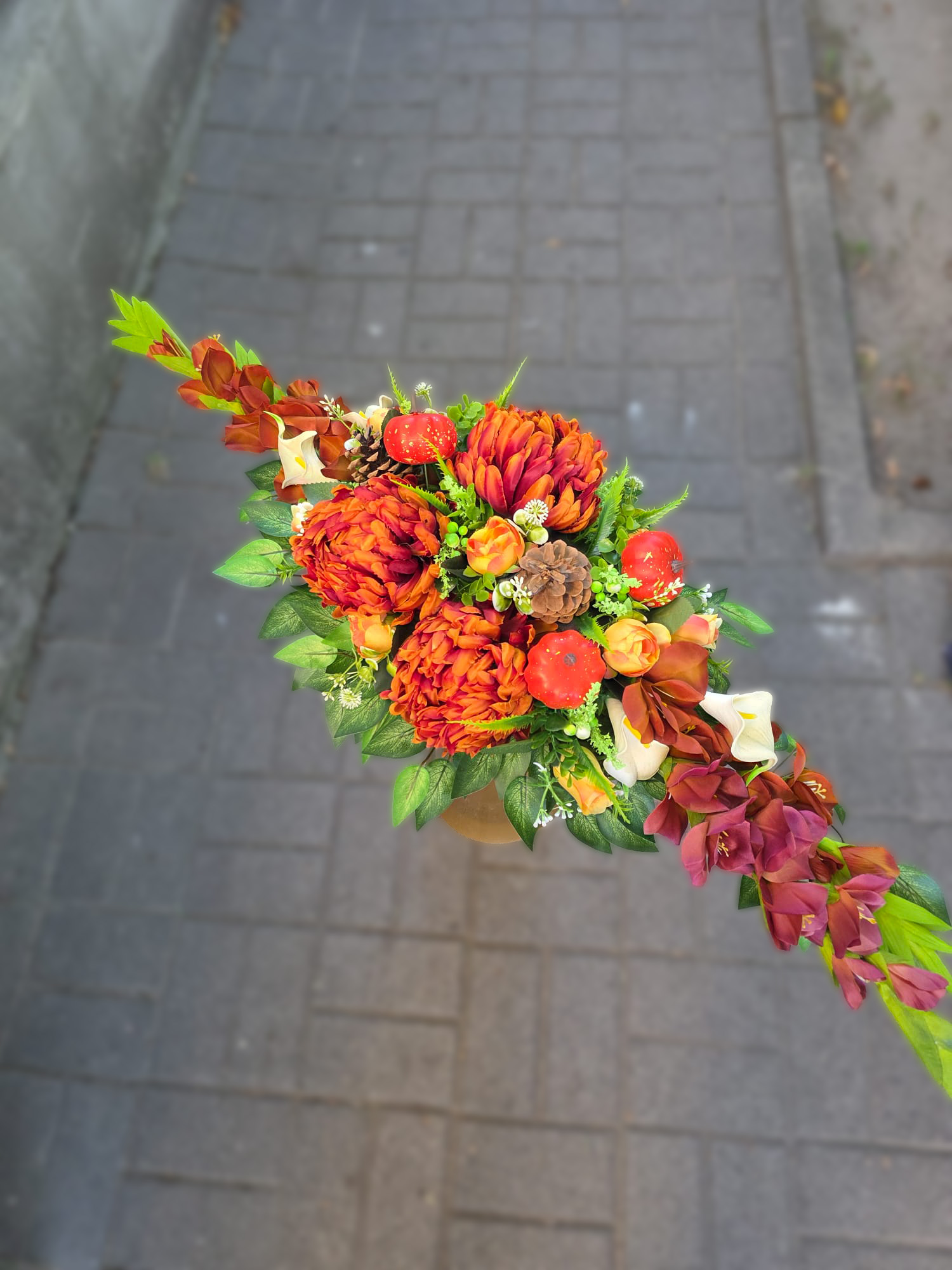 Bogata kompozycja w intensywnych odcieniach czerwieni i pomarańczy z jesiennymi dodatkami, takimi jak szyszki i ozdobne dynie, stanowi wyraziste upamiętnienie i dekorację na Święto Zmarłych.