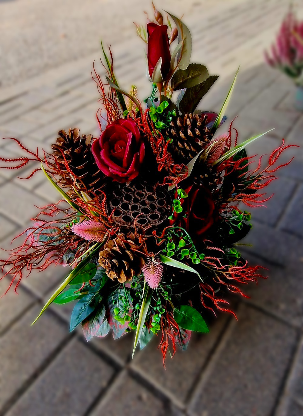 Stroik w głębokich odcieniach bordo i brązu z różami, szyszkami i naturalnymi akcentami to symboliczna kompozycja wyrażająca pamięć i powagę chwili.