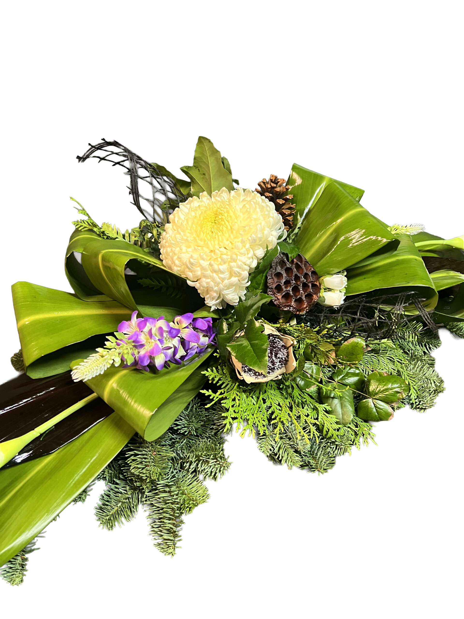 Stroik w chłodnej, eleganckiej tonacji, wykonany z białej chryzantemy, fioletowych mieczyków i białych kalii. Harmonijne połączenie barw podkreśla powagę i spokój chwili, stanowiąc gustowną dekorację nagrobka lub symboliczne upamiętnienie bliskich.