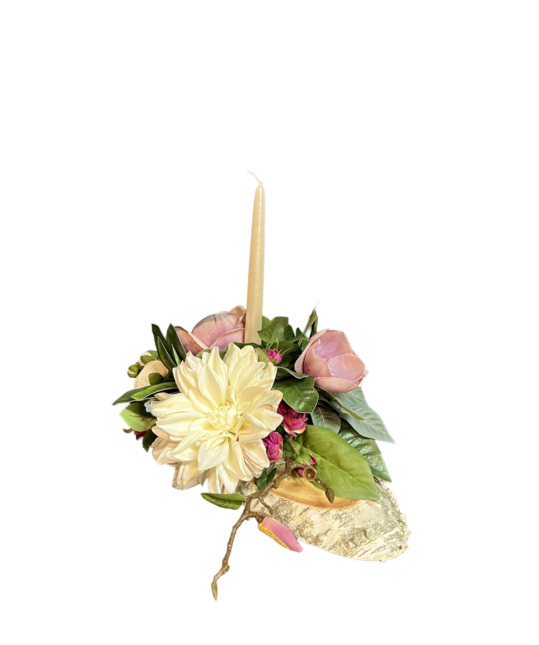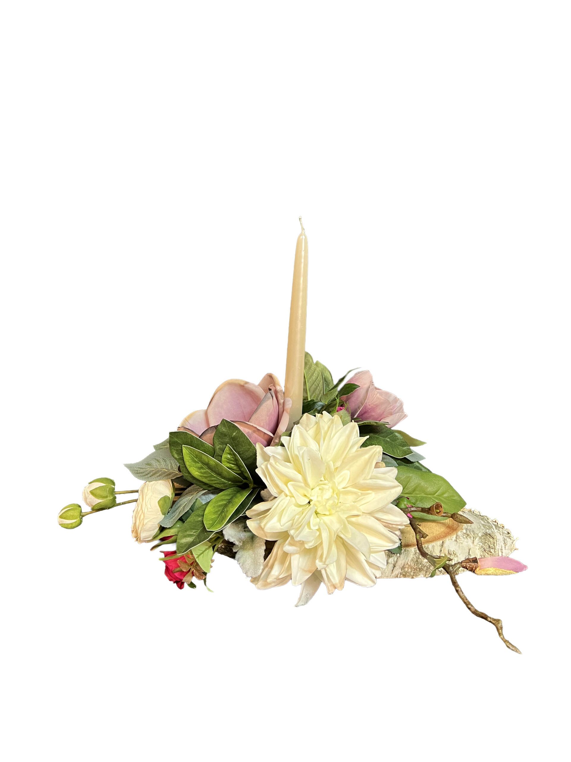 Delikatna kompozycja nagrobna z jasnym kwiatem centralnym, uzupełniona różowymi akcentami oraz dekoracyjną zielenią. Całość osadzona na naturalnej podstawie, tworzy subtelną i elegancką ozdobę miejsca pamięci w okresie świątecznym.