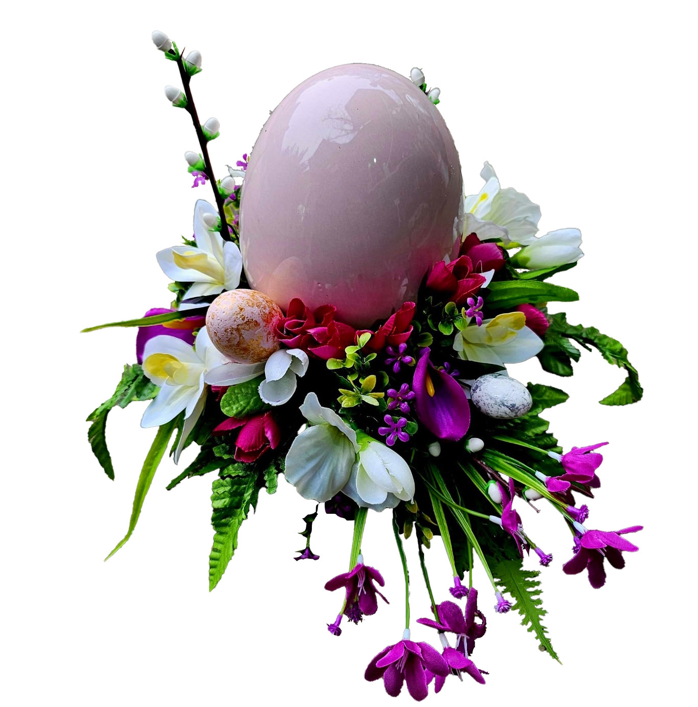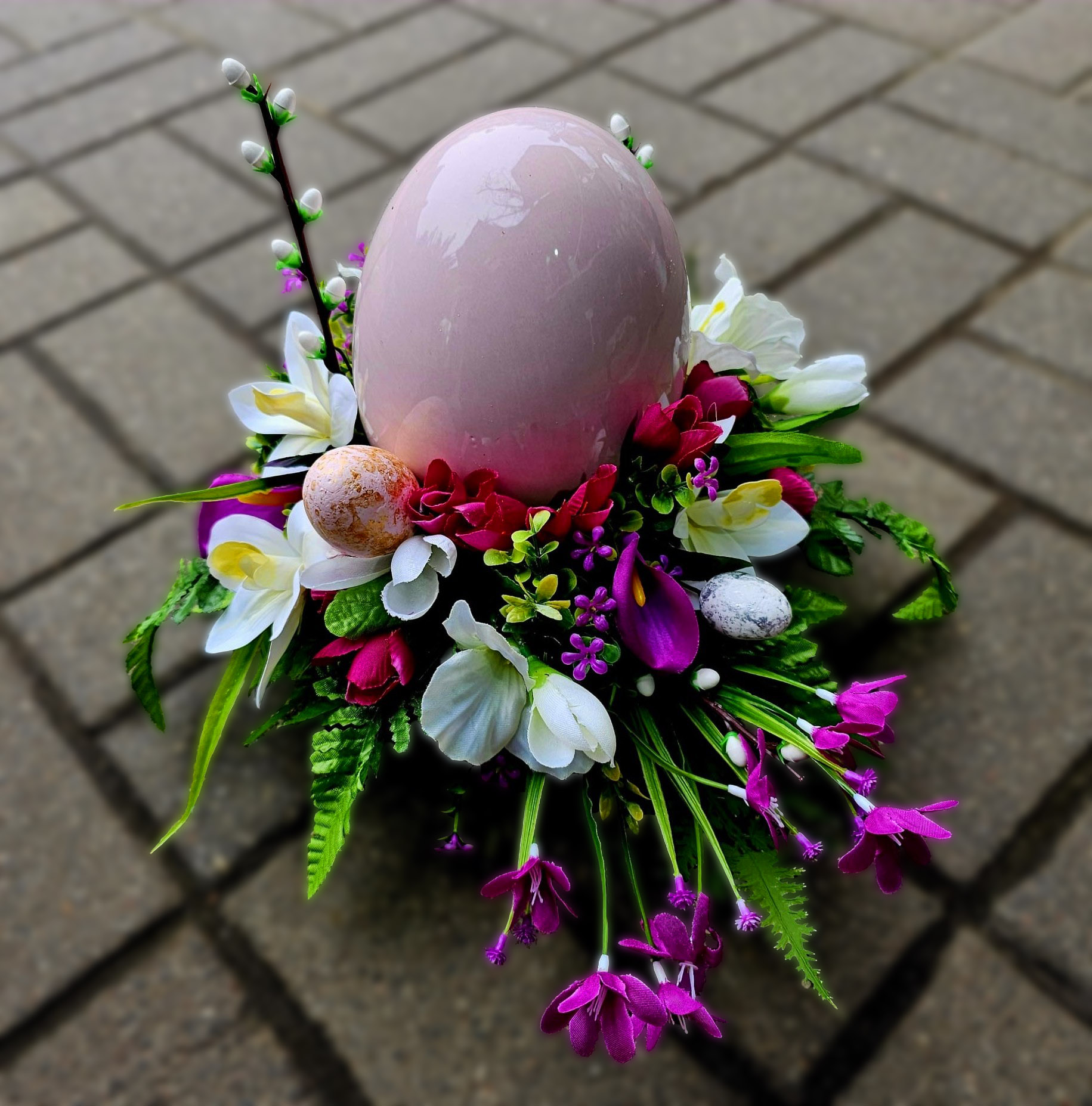 Kompozycja z ceramicznym jajem i akcentami w odcieniach różu i bieli – stonowana dekoracja na świąteczny czas.