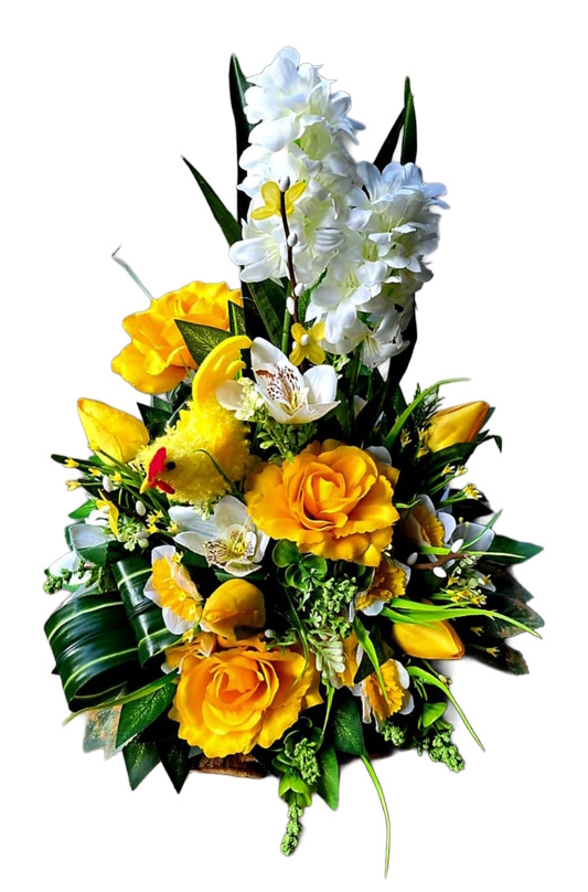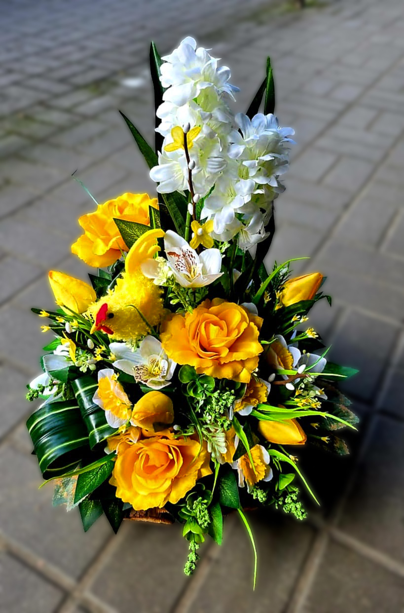 Wielkanocna kompozycja w odcieniach żółci i bieli, uzupełniona klasycznymi kwiatami oraz symbolicznym akcentem w centralnej części.