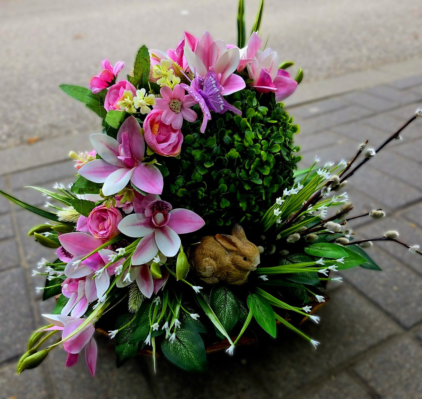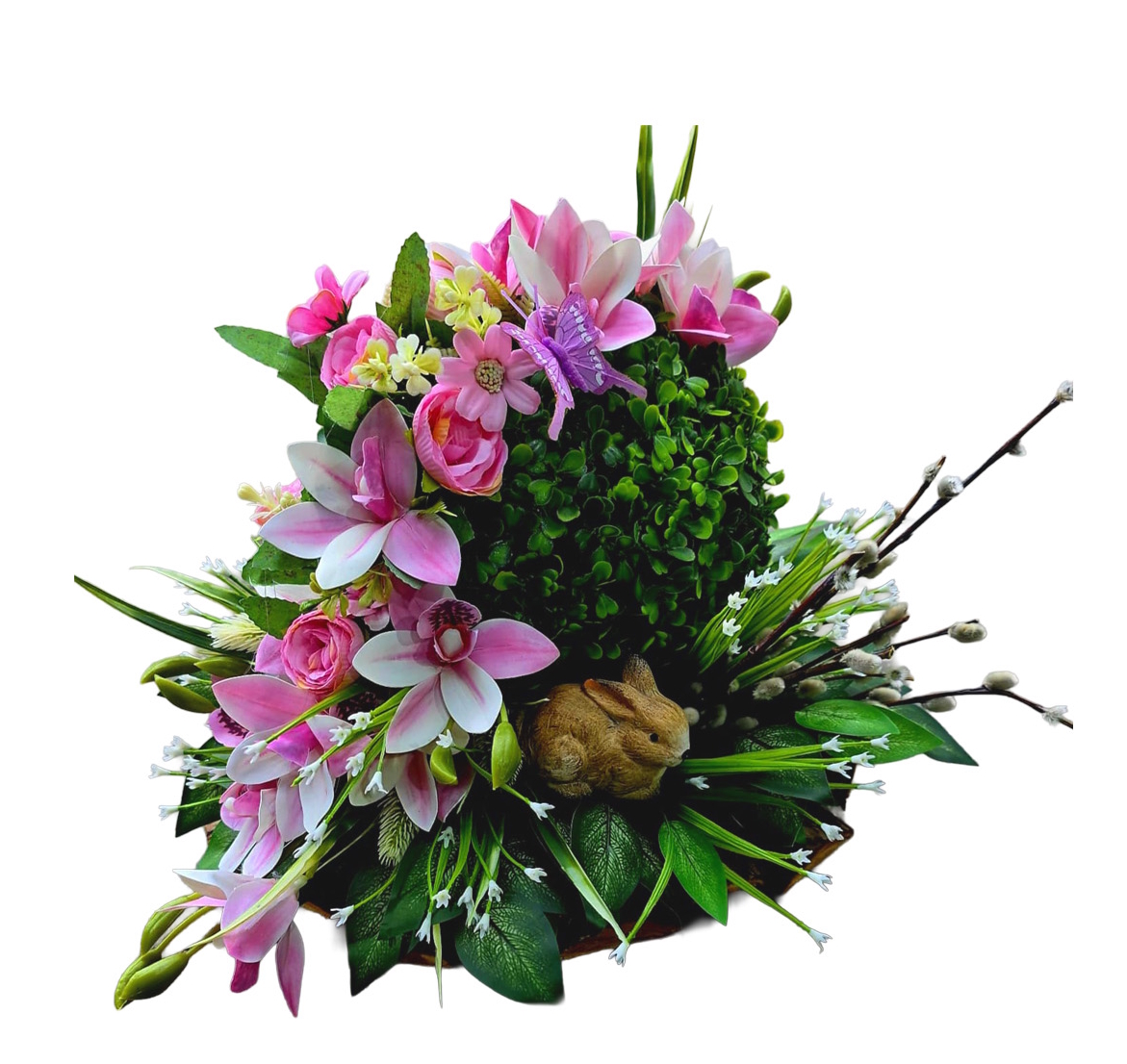 Wiosenna kompozycja w odcieniach różu i zieleni, ozdobiona figurką wielkanocną umieszczoną w centralnej części stroika. Kwiaty magnolii, ranunkulusy i dekoracyjne gałązki tworzą subtelną, a zarazem efektowną całość, idealną do upamiętnienia Świąt Wielkanocnych w symboliczny sposób.
