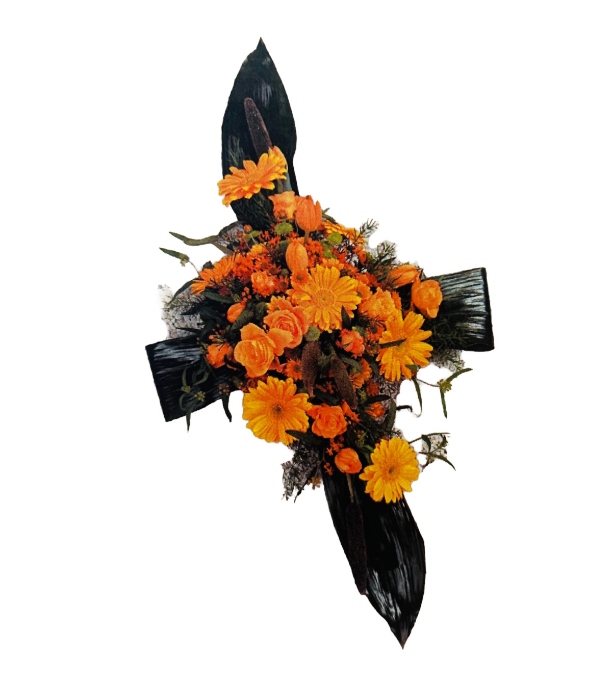 Oryginalna, krzyżowa forma podkreślona przez intensywnie pomarańczowe kwiaty o różnych odcieniach – od ognistych po delikatniejsze, morelowe tony. Nietuzinkowy wybór dla osób poszukujących wyrazistego, nowoczesnego akcentu na miejsce pochówku.