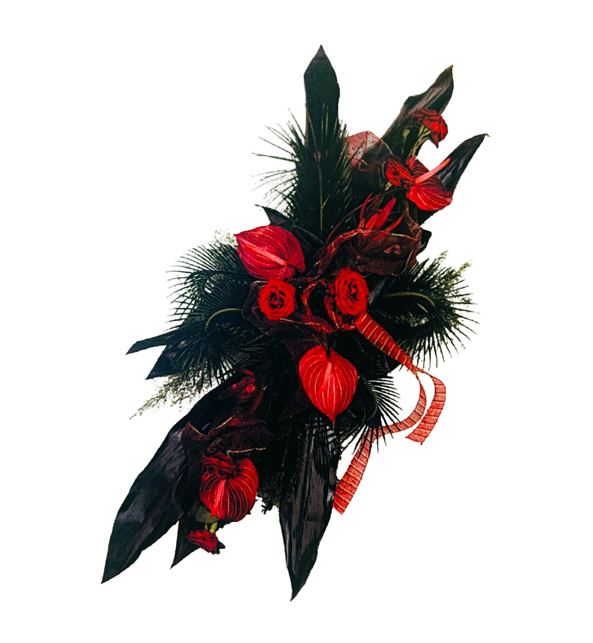 Elegancka wiązanka utrzymana w odcieniach głębokiej czerwieni, zbudowana z róż i anturium. Podłużna forma podkreślona jest przez ozdobną wstęgę i ciemne liście, które nadają całości dramatycznego, ale szlachetnego wyrazu.