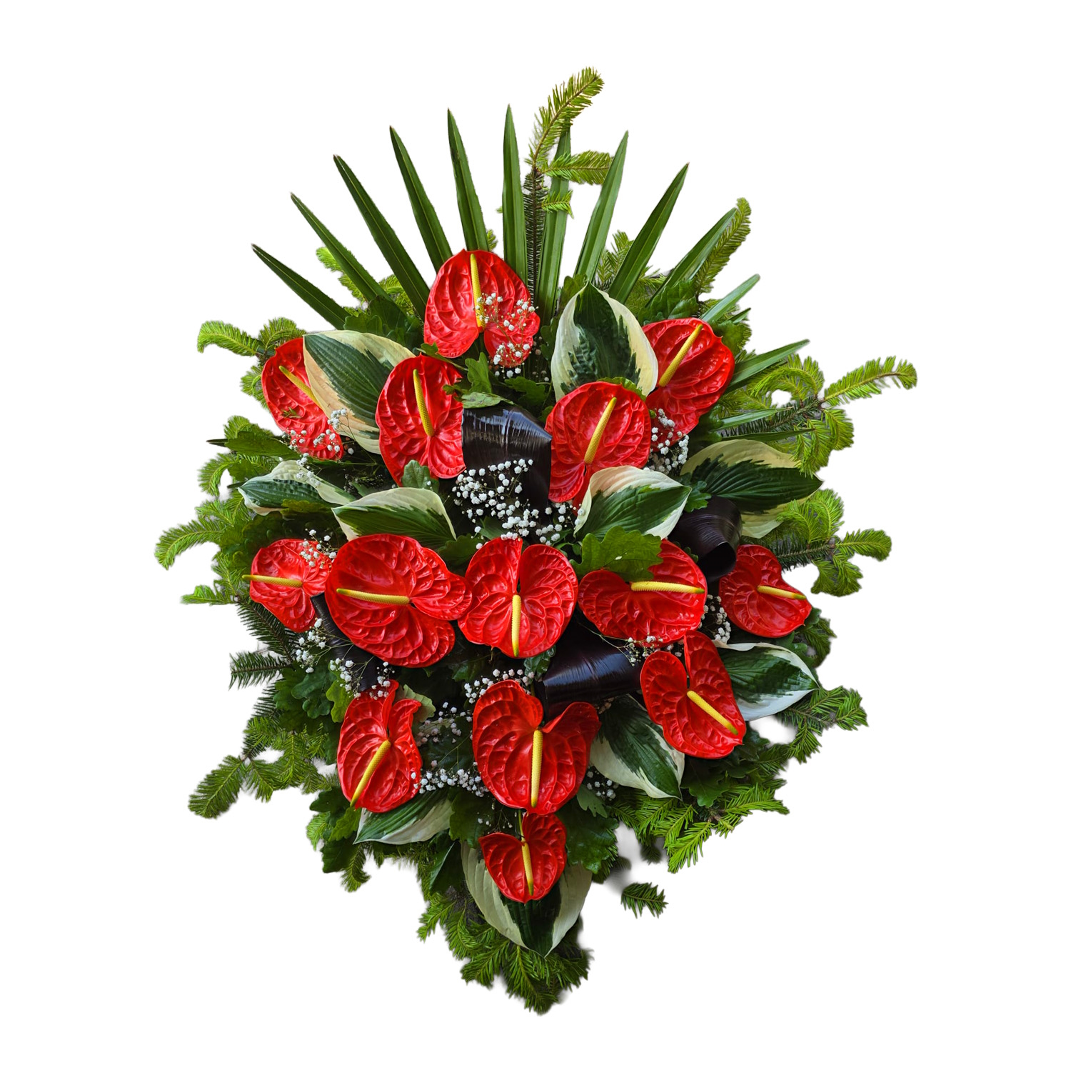 Wyrazista wiązanka z czerwonych anturium, symbolizujących miłość, pamięć i szacunek, wzbogacona białą gipsówką i dekoracyjną zielenią. Kompozycja emanuje powagą i elegancją, stanowiąc godny sposób na pożegnanie bliskiej osoby.