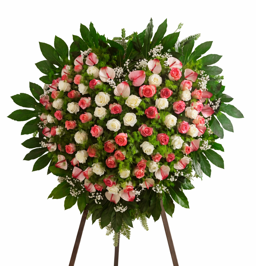 Wzruszająca kompozycja w kształcie serca, będąca symbolem głębokiej miłości, pamięci i wdzięczności. Połączenie kremowych i pudroworóżowych róż z delikatnymi anturium oraz zielonym tłem tworzy wyrazisty, a zarazem pełen klasy hołd dla osoby zmarłej. Kompozycja została starannie uformowana, by w pełni oddać emocje, które trudno wyrazić słowami.